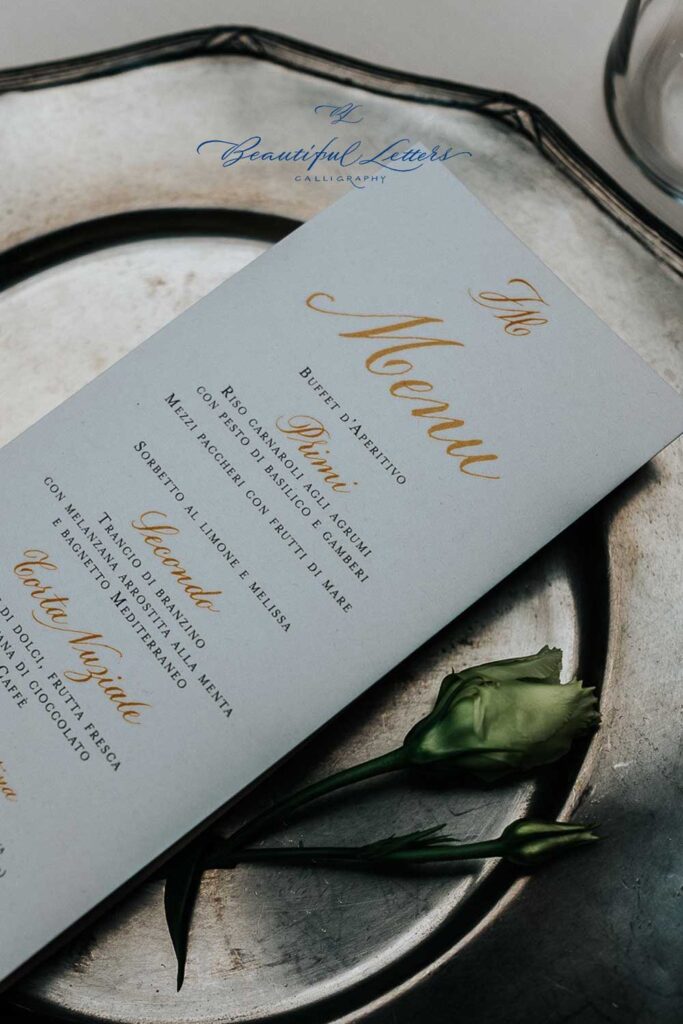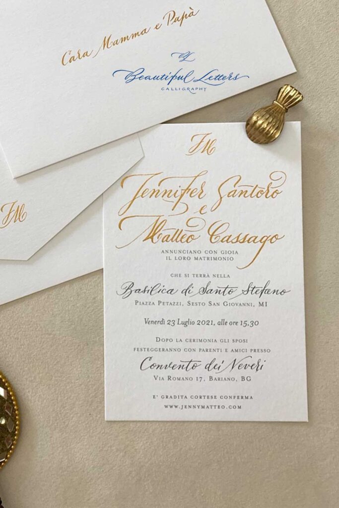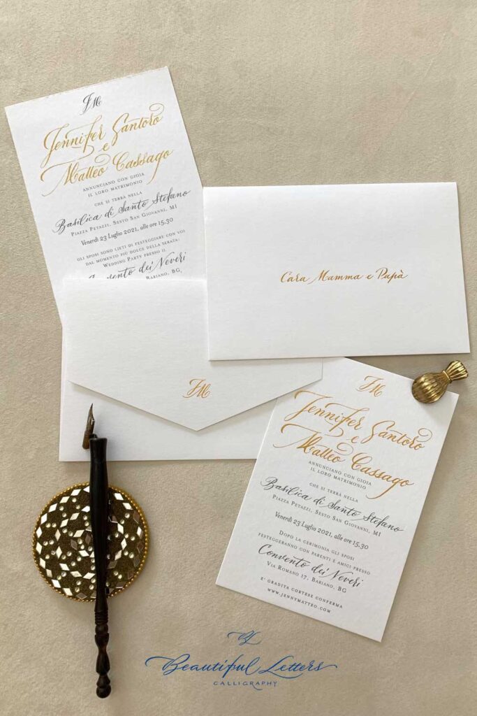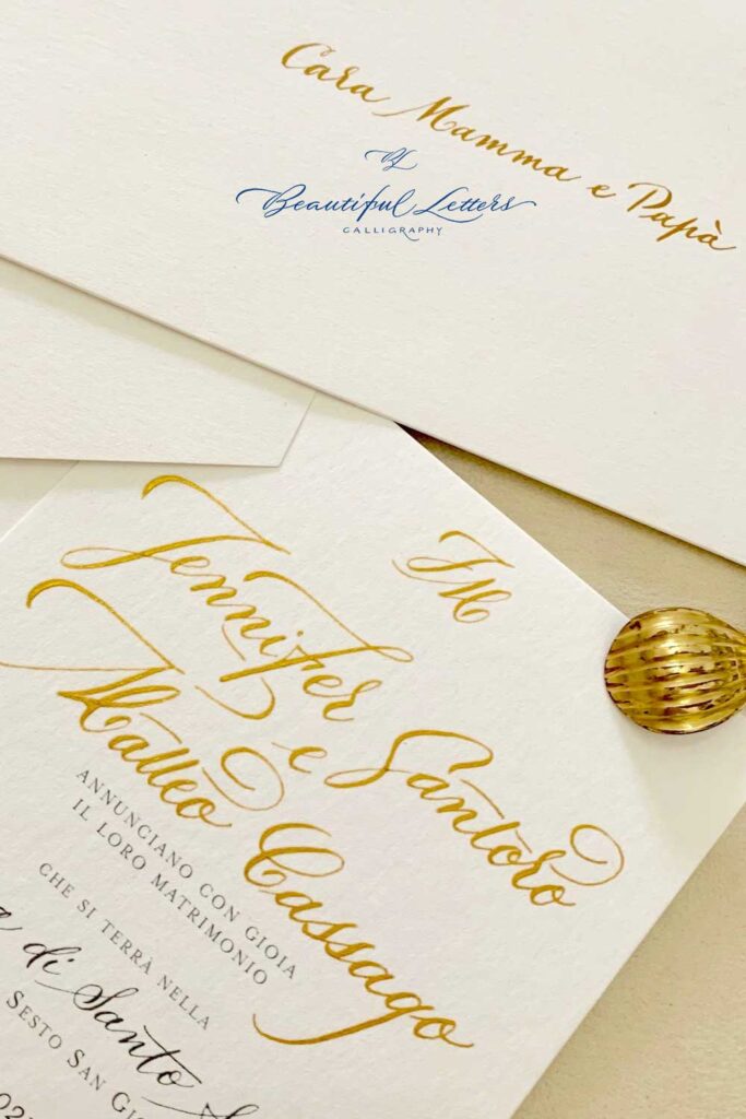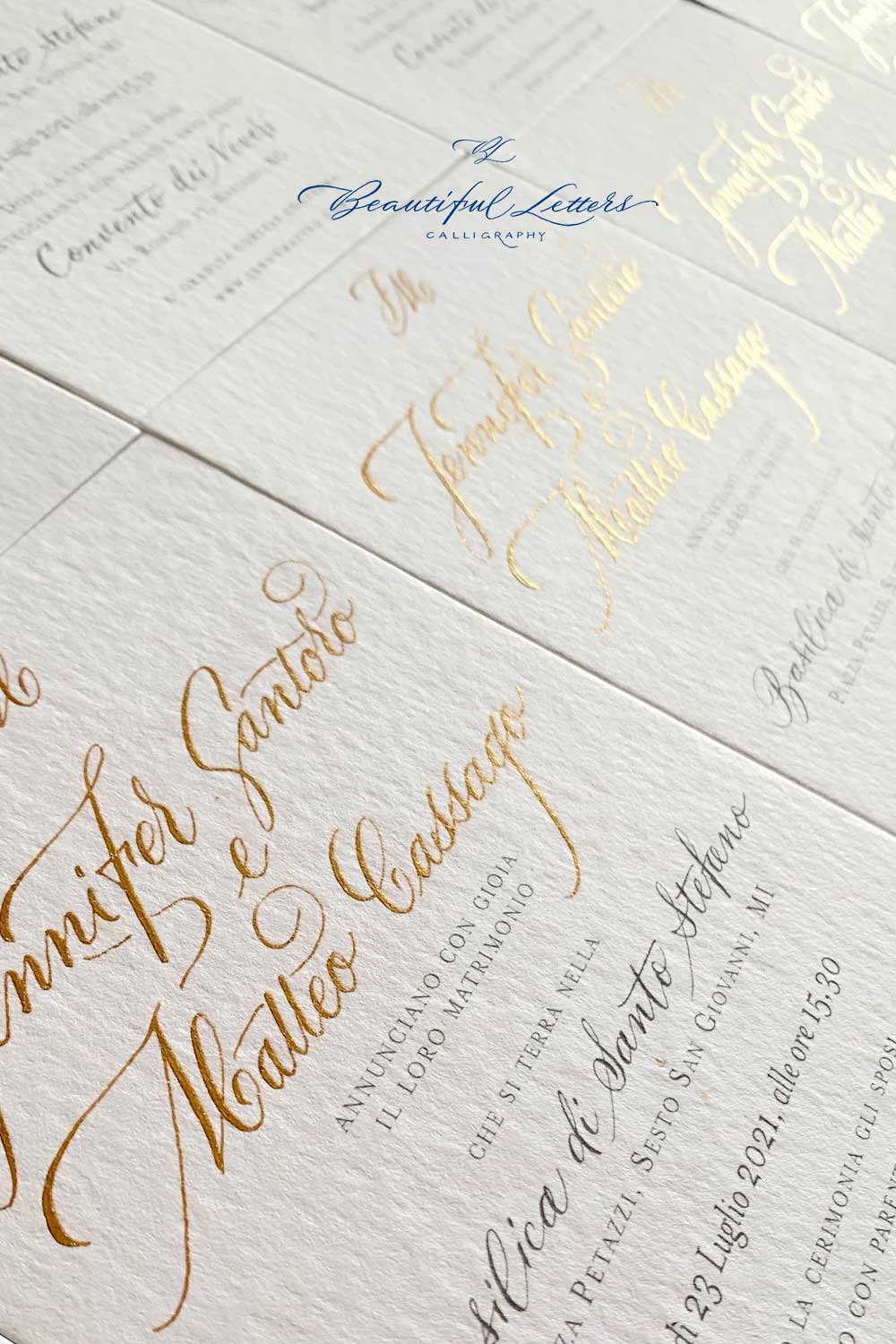 e una wedding suite calligrafata in oro realizzata a mano.