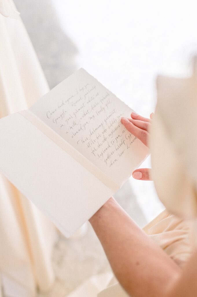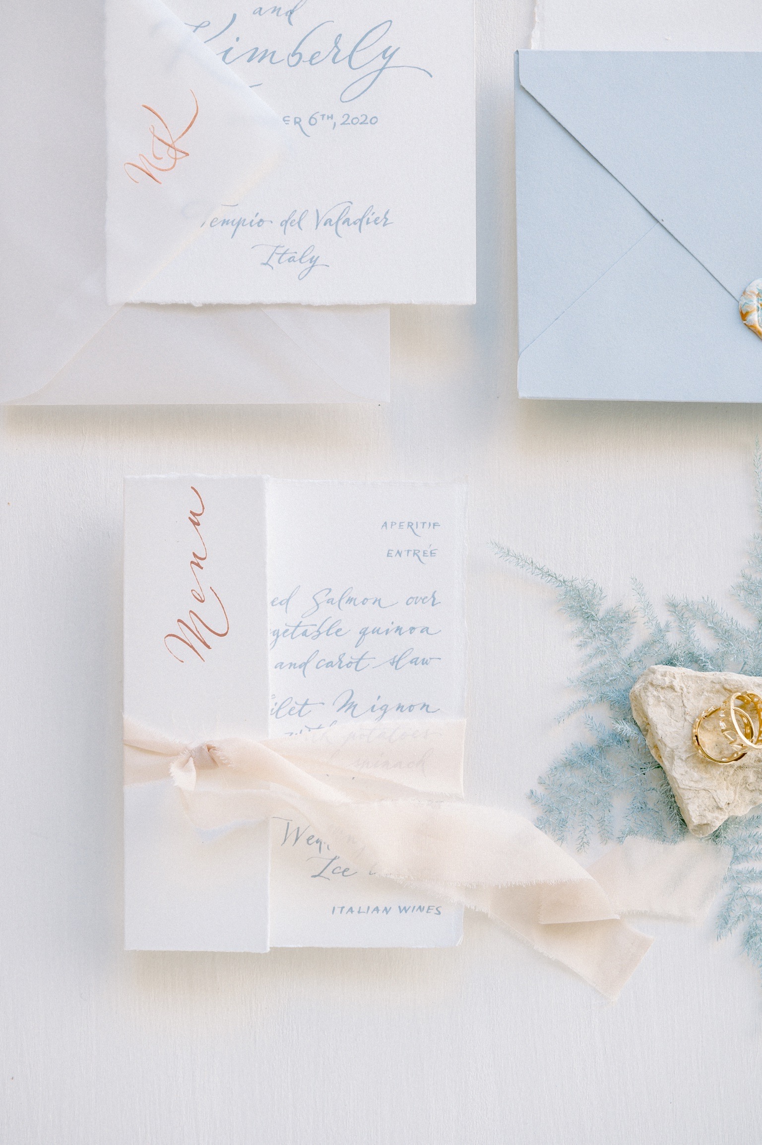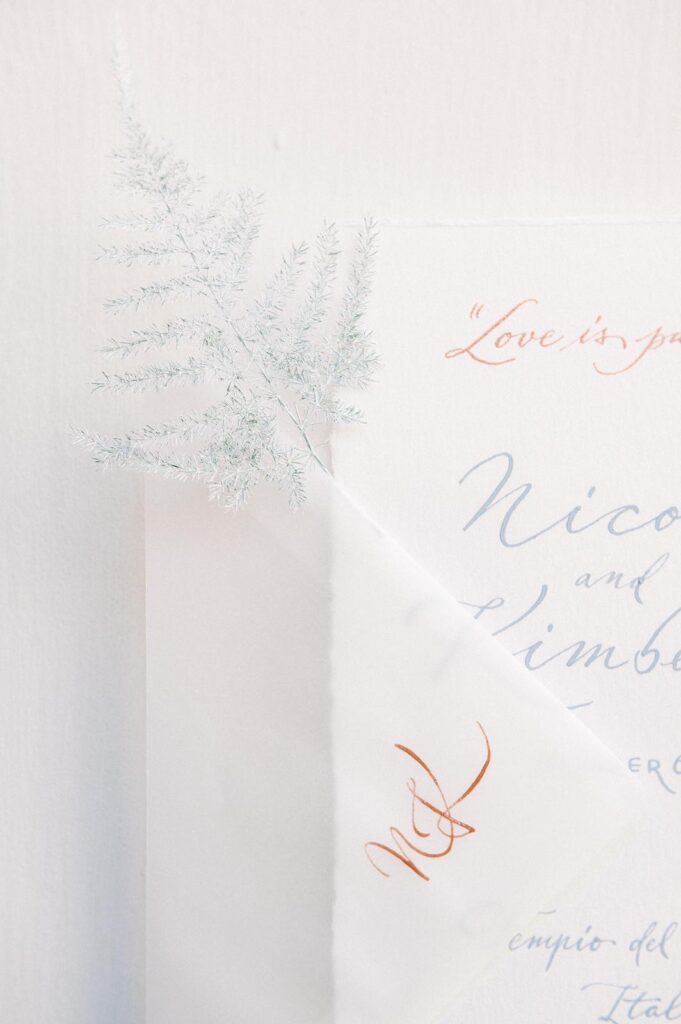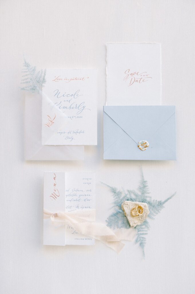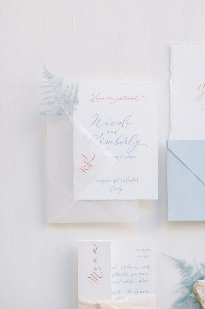 Cristina and Marco of Beautiful Letters developed the entire calligraphed stationery, started from the “welcome” on the cotton cloth to the menu. They used fine cotton paper and custom modern calligraphic style. All pieces are adorned with silk knots.