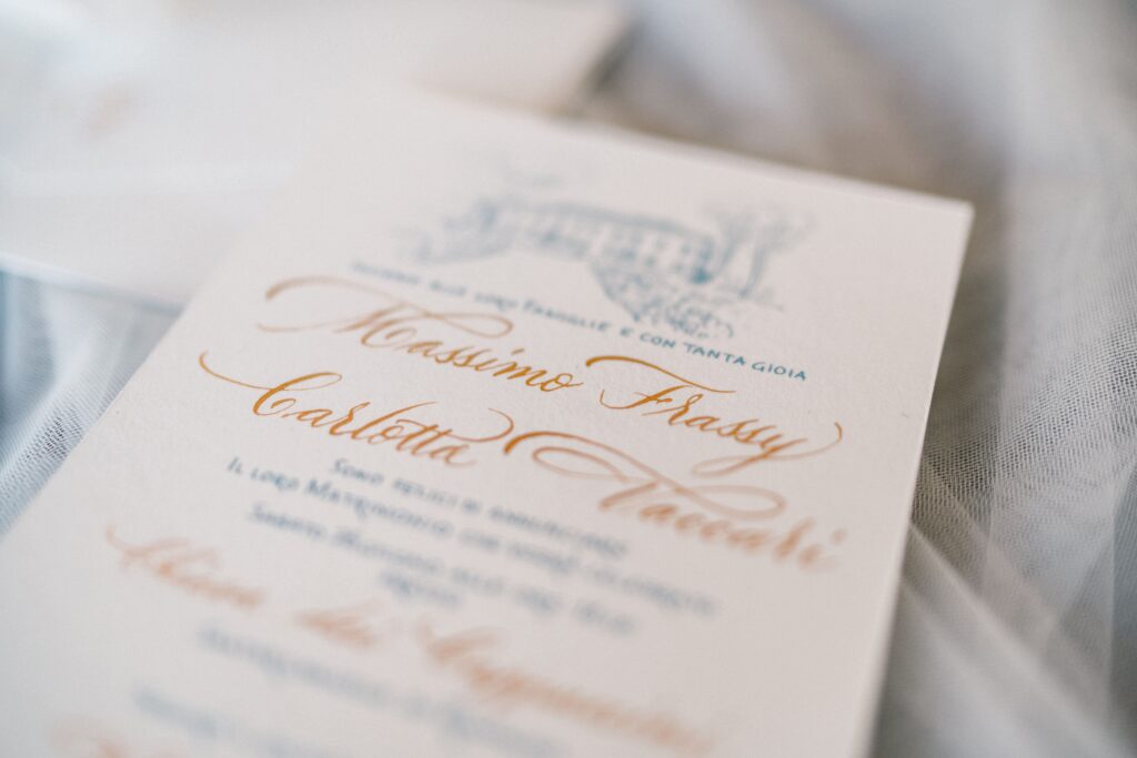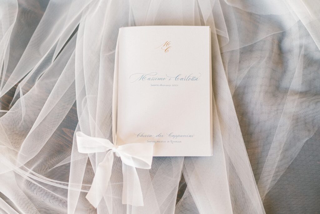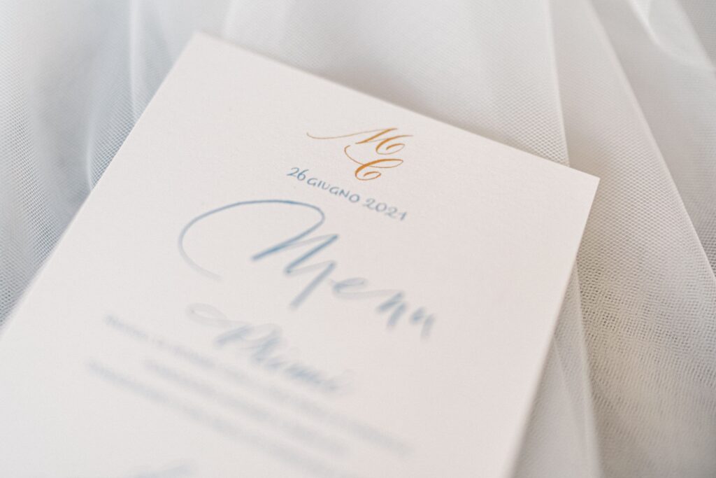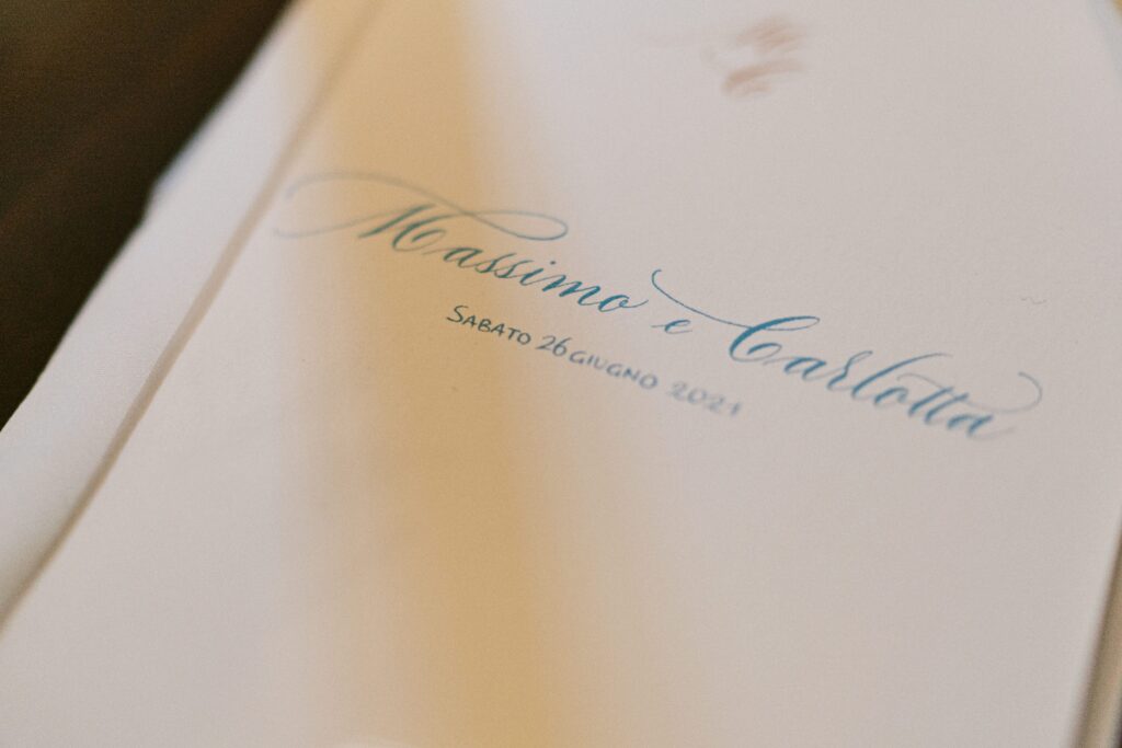 For Massimo and Carlotta’s wedding we have created everything you need, from invitations to the tableau de mariage, menus to ceremony booklets, cards for sugared almonds and gift bottles.